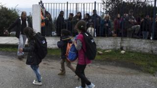 Image copyright APA protest has marred the first day of school for young refugees in Greece, with some 1,500 children getting education under a nationwide programme.