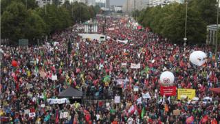 There were large crowds carrying flags and banners in seven German cities, including Berlin, Munich, Hamburg and Frankfurt, all braving cool and wet weather.